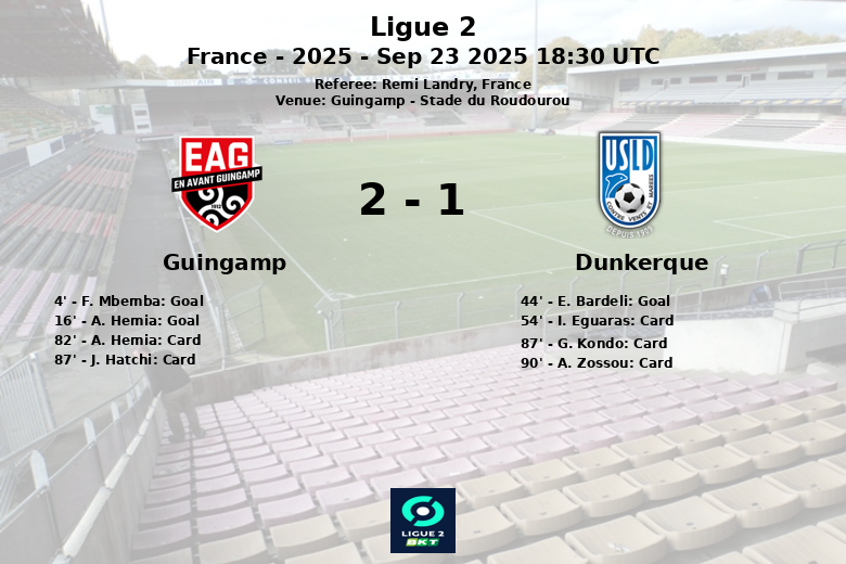 El Guingamp comenzó con fuerza, abriendo el marcador tempranamente a los 4 minutos con un gol de F. Mbemba, asistido por A. Hemia. A los 16 minutos, A. Hemia amplió la ventaja para el equipo local, esta vez con asistencia de G. Ott. Parecía que el Guingamp tenía el control del partido, pero el Dunkerque reaccionó al filo del descanso. En el minuto 44, E. Bardeli descontó para el Dunkerque con una asistencia de G. Yassine, dando esperanzas a su equipo para la segunda mitad.