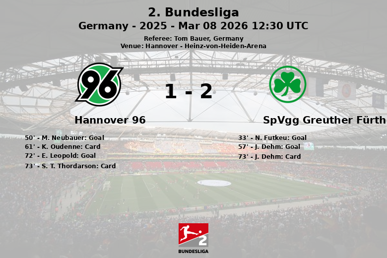 En la segunda mitad, el Hannover 96 reaccionó rápidamente. M. Neubauer igualó el marcador en el minuto 50, asistido por H. Chakroun, llevando el partido a un empate 1-1. Sin embargo, la alegría local duró poco, ya que J. Dehm volvió a adelantar al Fürth en el minuto 57, con asistencia de N. Futkeu, estableciendo un 1-2.
