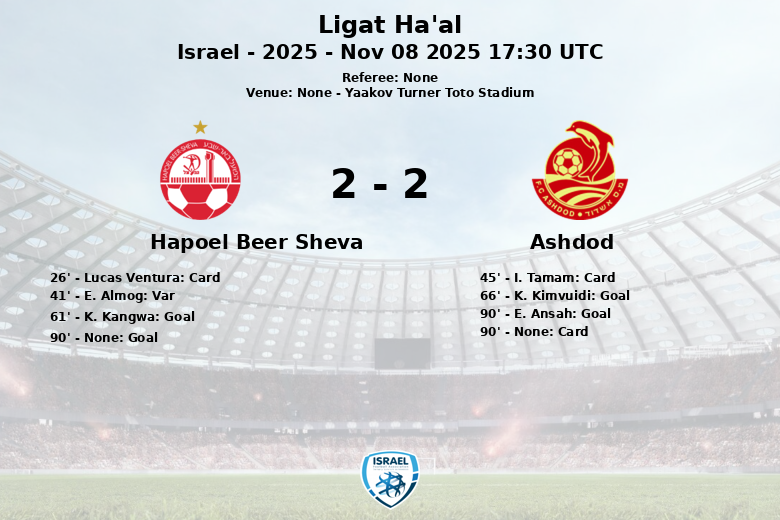 El partido tuvo su primer momento álgido cuando un gol de E. Almog para Hapoel Beer Sheva fue anulado por fuera de juego al minuto 41. Sin embargo, Hapoel Beer Sheva logró abrir el marcador al minuto 61 gracias a un penal convertido por K. Kangwa. La alegría duró poco, ya que Ashdod empató al minuto 66 con un gol de K. Kimvuidi.
