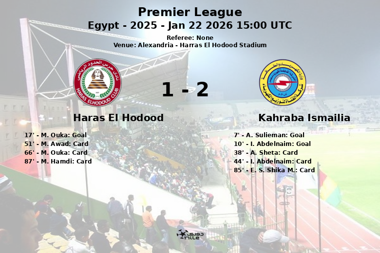 Alexandria, Egipto – En un encuentro correspondiente a la fecha 15 de la Premier League egipcia, Kahraba Ismailia logró imponerse a Haras El Hodood con un marcador que reflejó la intensidad del juego. Desde el pitido inicial, Kahraba Ismailia mostró su poder ofensivo, abriendo el marcador temprano con goles de A. Sulieman al minuto 7, asistido por H. El Shazly, y de I. Abdelnaim al minuto 10, también con asistencia de El Shazly.