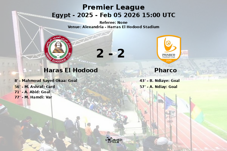 Haras El Hodood tomó la delantera temprano con un gol de Mahmoud Sayed Okaa en el minuto 8, asistido por M. Hamdi. El equipo local parecía tener el control, pero Pharco respondió justo antes del descanso con un tanto de B. Ndiaye, gracias a una asistencia de A. Shaaban, igualando el marcador.