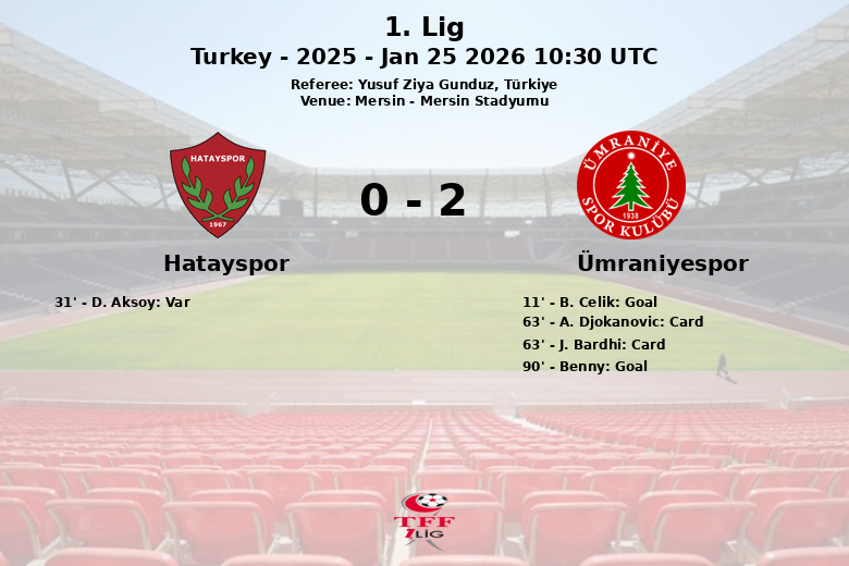 El Ümraniyespor se impuso al Hatayspor en un partido reñido disputado en el Mersin Stadyumu, con un resultado final de 2 a 0. El encuentro, correspondiente a la jornada 22 de la 1. Lig turca, fue arbitrado por Yusuf Ziya Gunduz.