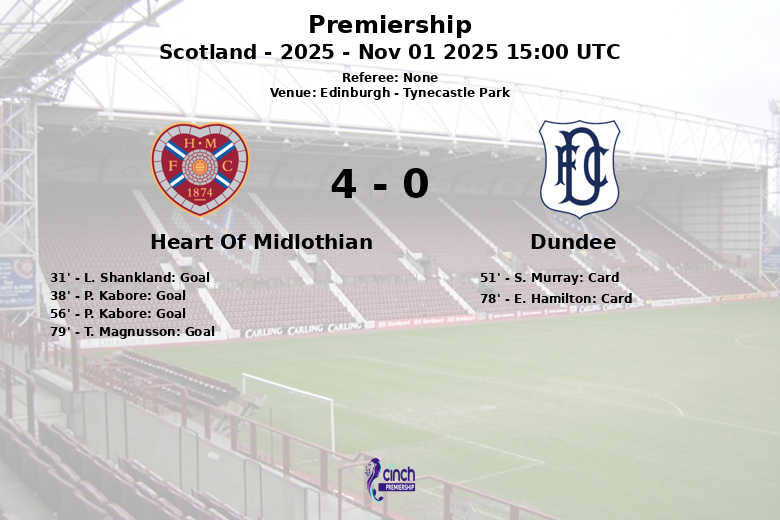 En la segunda mitad, P. Kabore volvió a marcar al minuto 56, consolidando la ventaja para el equipo local. El Dundee, a pesar de intentar reaccionar, se encontró con una defensa sólida y un control del juego casi absoluto por parte del Heart Of Midlothian. T. Magnusson selló la victoria al minuto 79 con el cuarto gol. El Dundee, con un 33% de posesión y sólo 5 tiros, ninguno a puerta, no pudo hacer frente al poderío del equipo de Edimburgo. El partido también estuvo marcado por las tarjetas amarillas a S. Murray y E. Hamilton del Dundee, reflejando la frustración del equipo visitante ante la superioridad del rival. El Heart Of Midlothian demostró su calidad y ambición en esta temporada de la Premiership.