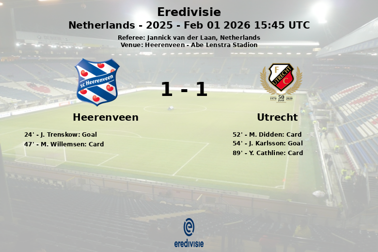 Heerenveen, Países Bajos – En un encuentro vibrante disputado en el Abe Lenstra Stadion, Heerenveen y Utrecht igualaron a un gol por bando en un partido correspondiente a la jornada 21 de la Eredivisie 2025. Ante la atenta mirada del árbitro Jannick van der Laan, el Heerenveen dominó la posesión con un 60%, mostrando mayor iniciativa ofensiva con 16 disparos, aunque solo 3 de ellos lograron inquietar al portero rival. J. Trenskow abrió el marcador para los locales al minuto 24 con una certera definición tras una asistencia de O. Braude. Sin embargo, el Utrecht reaccionó en la segunda mitad, cuando J. Karlsson igualó las acciones al minuto 54 con un remate producto de una asistencia de A. Alarcon. El encuentro fue tenso, con varias amonestaciones: M. Willemsen del Heerenveen al minuto 47, y M. Didden y Y. Cathline del Utrecht al 52 y 89 respectivamente. Pese al dominio territorial y los 5 saques de esquina a favor del Heerenveen, el Utrecht supo defenderse y aprovechar sus oportunidades. Con un 40% de posesión y 10 tiros, lograron el empate, dejando el partido en tablas. El Heerenveen cometió 10 faltas, mientras que el Utrecht realizó 8.