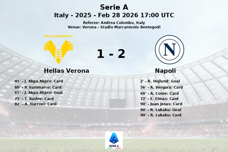 En el minuto 90, cuando parecía que el Hellas Verona se llevaría la victoria, R. Lukaku anotó para el Napoli, igualando el marcador y evitando la derrota. Lukaku también recibió una tarjeta amarilla en el mismo minuto. A pesar del dominio en la posesión y los cinco tiros a puerta, el Napoli tuvo que luchar hasta el último minuto para asegurar un punto valioso en su visita a Verona. El partido finalizó con un balance de 8 tiros para el Napoli y 9 para el Hellas Verona.