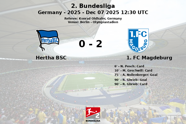 La segunda mitad trajo la emoción. En el minuto 75, A. Nollenberger abrió el marcador para el Magdeburg con una asistencia de B. Atik. El Hertha intentó reaccionar, pero la defensa del Magdeburg se mantuvo firme. En el tiempo de descuento (minuto 90), R. Ghrieb sentenció el partido con un segundo gol para el Magdeburg, asistido por D. Stalmach. Ghrieb también recibió una tarjeta amarilla tras su gol.