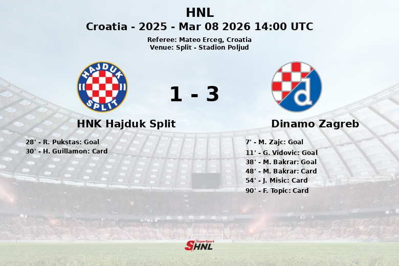 Split, Croacia – El Dinamo Zagreb se impuso con autoridad al HNK Hajduk Split en el clásico del fútbol croata disputado en el Stadion Poljud. Un contundente inicio de partido por parte del Dinamo, con goles de M. Zajc al minuto 7, G. Vidovic al minuto 11 y M. Bakrar al minuto 38, sentenció el encuentro. El Hajduk Split, pese a tener una mayor posesión del balón (54% frente al 46% del Dinamo), no logró transformar su dominio en ocasiones claras de gol, marcando solo un tanto a través de R. Pukstas al minuto 28.