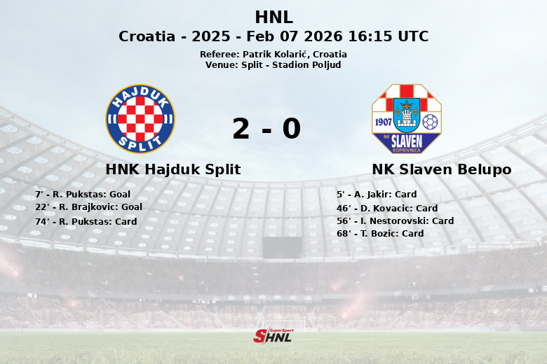 A pesar de que el NK Slaven Belupo intentó reaccionar y equilibrar el juego, la defensa del Hajduk se mostró sólida y organizada, frustrando los intentos del equipo visitante. El partido estuvo marcado por un alto número de faltas, con 17 cometidas por el Hajduk y 16 por el Slaven Belupo. El árbitro mostró cinco tarjetas amarillas durante el encuentro, una para el Hajduk y cuatro para el Slaven Belupo.