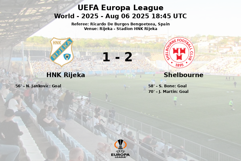 El Rijeka se adelantó en el minuto 56 gracias a un penalti convertido por N. Jankovic. Sin embargo, la alegría local duró poco, ya que S. Bone empató el partido para el Shelbourne apenas dos minutos después. La remontada se consumó en el minuto 70 con un gol de J. Martin, dándole la victoria final al conjunto irlandés.