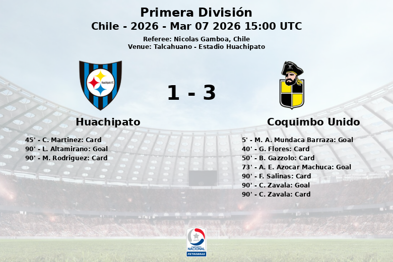 En un partido disputado en el Estadio Huachipato de Talcahuano, Coquimbo Unido se impuso con autoridad sobre el equipo local, Huachipato. El encuentro, correspondiente a la sexta jornada de la Primera División chilena, terminó con un marcador favorable a los visitantes, quienes demostraron mayor efectividad de cara al arco.