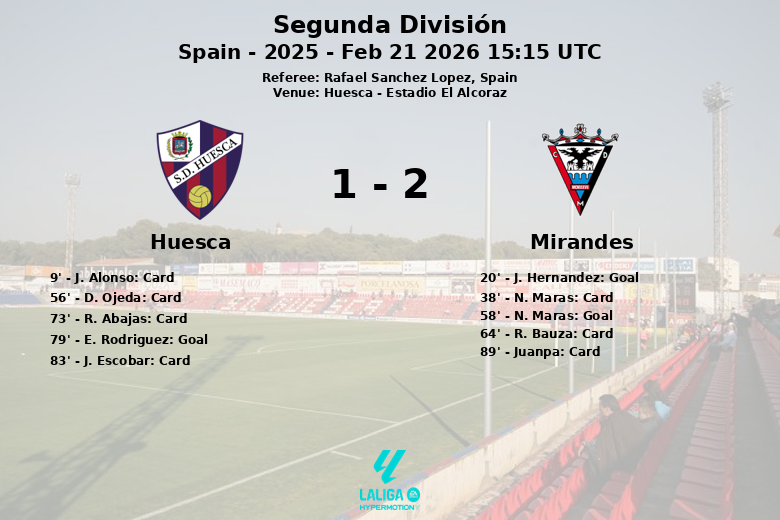 El Mirandés abrió el marcador en el minuto 20 con un gol de J. Hernandez tras una asistencia de F. Medrano. El segundo tanto llegó en el minuto 58, con N. Maras rematando a la red gracias a una asistencia de J. Hernandez. El Huesca descontó en el minuto 79 con un gol de E. Rodriguez.