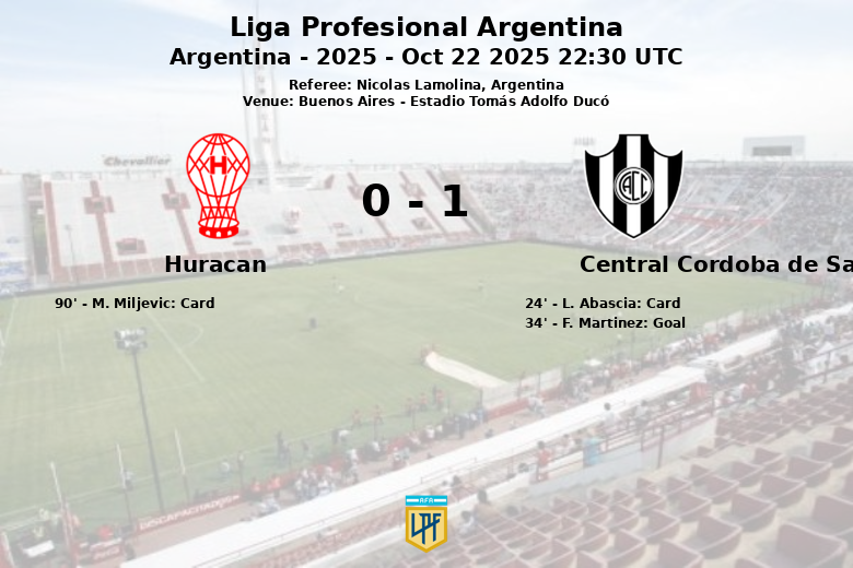 Buenos Aires – En un encuentro disputado en el Estadio Tomás Adolfo Ducó, Central Córdoba de Santiago del Estero se llevó una valiosa victoria ante Huracán. El partido, correspondiente a la jornada 13 de la Liga Profesional Argentina, vio a los santiagueños imponerse gracias a un gol de Fernando Martínez en el minuto 34, tras una asistencia de M. Perello. A pesar del dominio en la posesión de balón por parte de Huracán (60%), que intentó revertir el marcador con 24 tiros (5 a puerta), la defensa de Central Córdoba se mantuvo firme. El equipo local generó 8 córners y cometió 7 faltas, recibiendo una tarjeta amarilla para M. Miljevic en el minuto 90. Por su parte, Central Córdoba, con un 40% de posesión, aprovechó sus oportunidades con 6 tiros (3 a puerta) y se defendió con solidez. L. Abascia recibió una tarjeta amarilla para el equipo visitante en el minuto 24. El encuentro, arbitrado por Nicolás Lamolina, demostró la efectividad de Central Córdoba frente al ímpetu ofensivo de Huracán.