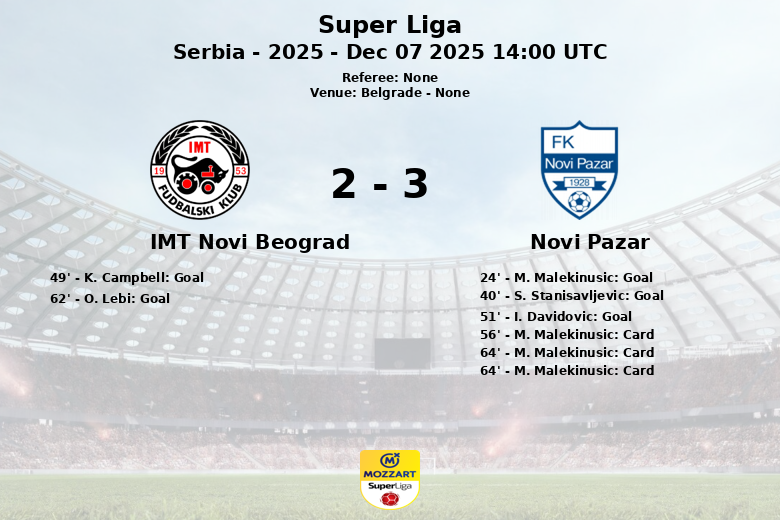 K. Campbell descontó para el IMT al minuto 49 con un gol asistido por L. Lukovic. Sin embargo, la alegría local duró poco, ya que I. Davidovic amplió la ventaja para Novi Pazar al minuto 51, con asistencia de M. Malekinusic.