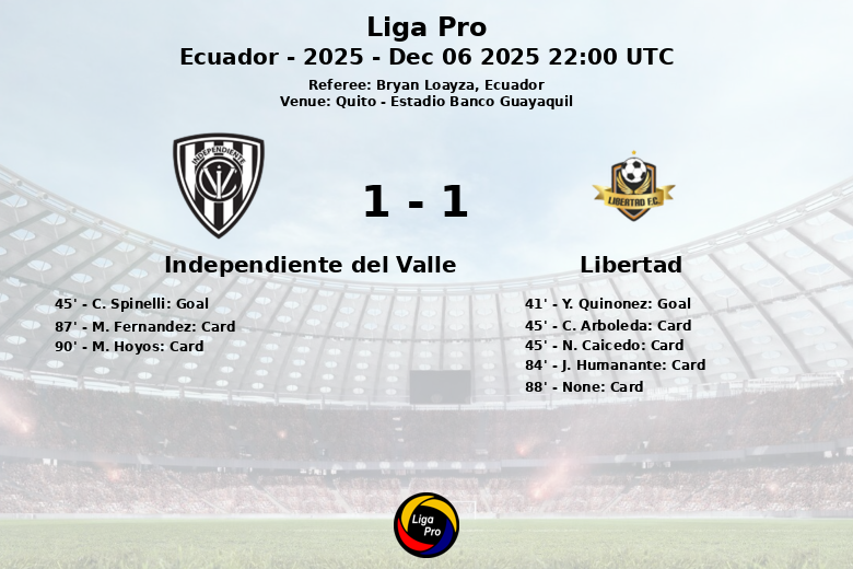 El primer tiempo fue de alta tensión. Y. Quinonez abrió el marcador para Libertad al minuto 41 con una excelente definición tras asistencia de R. Biojo. Sin embargo, la alegría duró poco, ya que sobre el final del primer tiempo, C. Spinelli igualó el marcador para Independiente del Valle con un gol asistido por L. Loor. La intensidad del juego se reflejó en las tarjetas amarillas mostradas a C. Arboleda y N. Caicedo por Libertad, y luego a M. Fernandez y M. Hoyos por Independiente del Valle. J. Humanante y otro jugador de Libertad (sin identificar) también vieron la tarjeta amarilla.