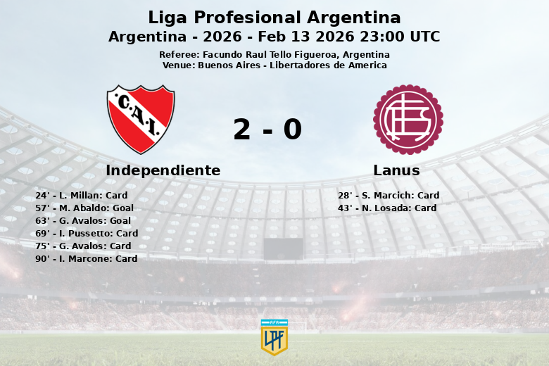 Home Matches Independiente vs Lanus Feb 13 2026 23:00 UTC