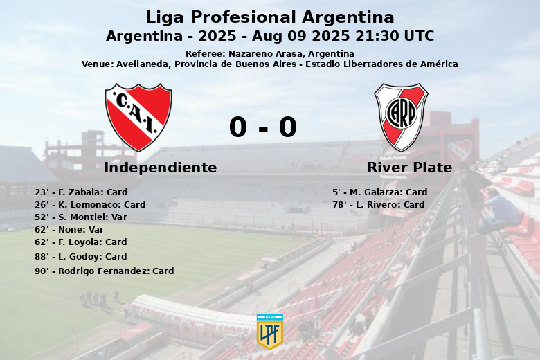 Avellaneda, Provincia de Buenos Aires – En un encuentro disputado en el Estadio Libertadores de América, Independiente y River Plate empataron 0 a 0 en un partido cargado de tensión y decisiones arbitrales controvertidas. El árbitro Nazareno Arasa, en el marco de la Liga Profesional Argentina, dirigió un partido donde las tarjetas amarillas y las anulaciones de gol por fuera de juego fueron protagonistas.