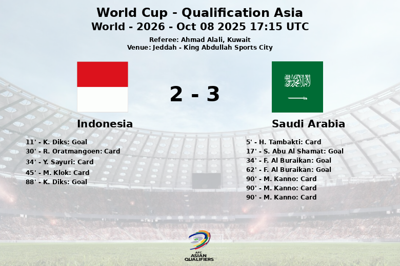 En un encuentro correspondiente a la clasificación para la Copa del Mundo 2026, Arabia Saudita venció a Indonesia en el King Abdullah Sports City de Jeddah. El partido, arbitrado por Ahmad Alali, estuvo marcado por la intensidad y las tarjetas.
