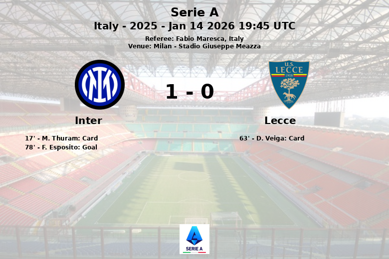 Milán – En un partido disputado en el Stadio Giuseppe Meazza, el Inter de Milán se impuso al Lecce con un juego de posesión dominante (68%). Si bien el Inter generó un gran volumen de tiros (21), solo 7 lograron impactar la portería. La presión constante del Inter se tradujo en 11 saques de esquina, pero también en 11 faltas cometidas, una de las cuales le valió una tarjeta amarilla a M. Thuram en el minuto 17. El Lecce, por su parte, batalló para mantener la posesión (32%) y solo logró realizar 10 tiros, con un único remate a puerta. Su juego, más defensivo, resultó en 14 faltas y una tarjeta amarilla para D. Veiga en el minuto 63. El gol de la victoria llegó en el minuto 78, obra de F. Esposito, quien desató la alegría en la afición local. A pesar del esfuerzo del Lecce, la solidez defensiva y la superioridad en el mediocampo del Inter fueron determinantes para asegurar la victoria.