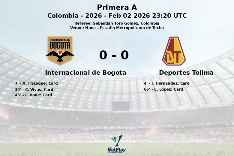 El Internacional de Bogotá también dominó en los tiros de esquina, sumando 6 frente a los 3 del Tolima. El árbitro, Sebastian Toro Gomez, se vio obligado a mostrar varias tarjetas amarillas, tres para jugadores del Internacional de Bogotá (A. Irazoque, C. Vivas y F. Bone) y una para E. Lopez del Tolima, reflejando la intensidad y las disputas del encuentro. El Tolima cometió 8 faltas, mientras que el Internacional de Bogotá cometió 9.
