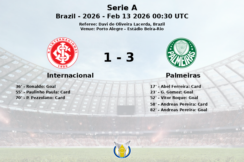 En un encuentro electrizante disputado en el Estádio Beira-Rio de Porto Alegre, Palmeiras se impuso a Internacional con un marcador final de 3 a 1. El partido, válido por la tercera ronda de la Serie A brasileña, fue testigo de un juego dinámico y disputado, con ambos equipos buscando el control del balón y la portería rival.