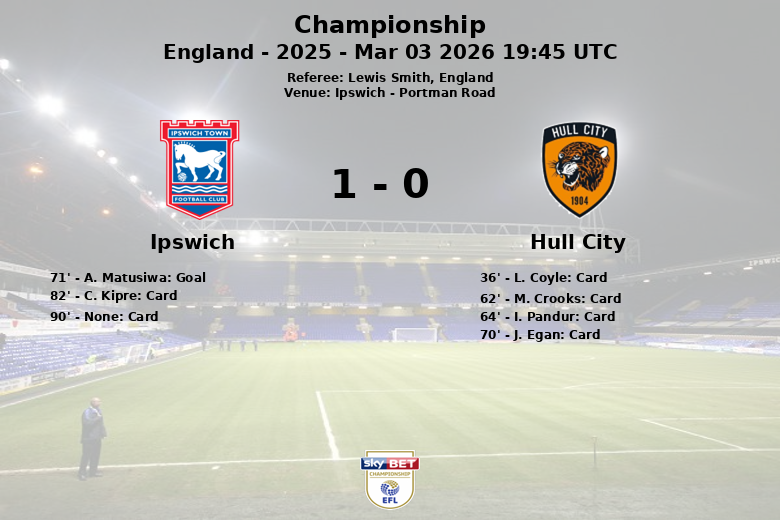 A pesar de las constantes faltas cometidas por el Hull City, que acumuló cuatro tarjetas amarillas, el Ipswich logró romper el empate en el minuto 71 gracias a un gol de A. Matusiwa, asistido por L. Davis. Este tanto reflejó la superioridad del Ipswich en el campo y su insistencia en buscar la victoria.