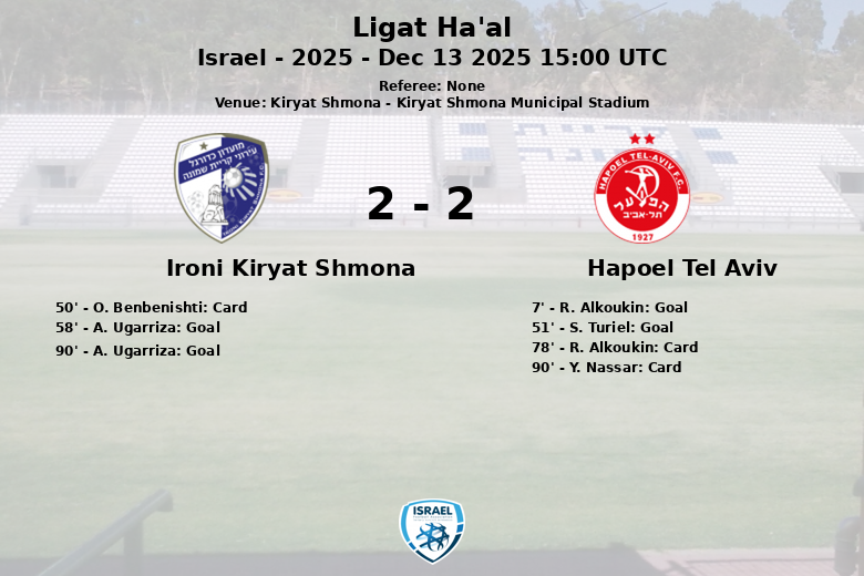 Kiryat Shmona, Israel – En un encuentro vibrante y lleno de alternativas, el Hapoel Tel Aviv y el Ironi Kiryat Shmona igualaron en el Kiryat Shmona Municipal Stadium, en partido correspondiente a la jornada 14 de la Ligat Ha’al. El Hapoel Tel Aviv comenzó con fuerza, abriendo el marcador al minuto 7 gracias a un gol de R. Alkoukin, asistido por S. Turiel. La ventaja se amplió al inicio del segundo tiempo, al minuto 51, cuando S. Turiel, con asistencia de R. Alkoukin, anotó el segundo gol para los visitantes.
