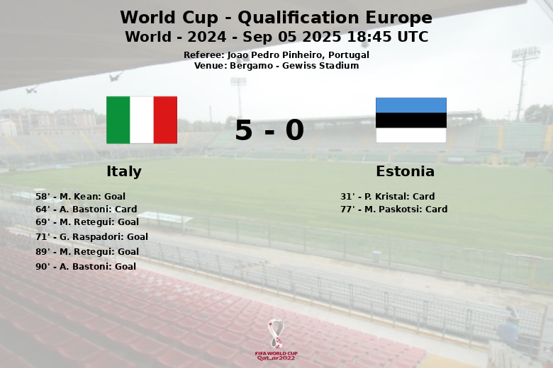 Estonia, por su parte, luchó por contener el ataque italiano, pero su posesión del 30% solo les permitió generar 4 disparos, con solo 2 dirigidos a la portería. El equipo estonio acumuló 13 faltas y recibió dos tarjetas amarillas (P. Kristal en el minuto 31 y M. Paskotsi en el minuto 77). Italia también recibió una tarjeta amarilla para A. Bastoni al minuto 64. El árbitro portugués Joao Pedro Pinheiro supervisó el encuentro.