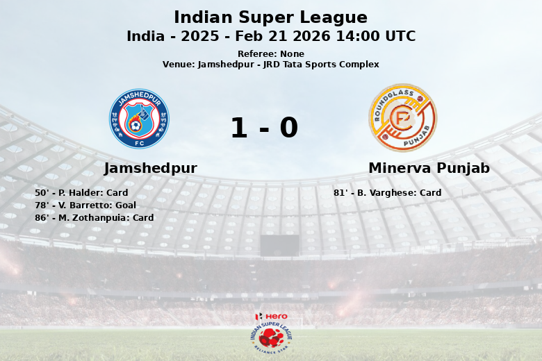 El partido se mantuvo sin goles hasta el minuto 78, cuando V. Barretto, sin asistencia aparente, logró perforar la portería rival, dando la ventaja definitiva a Jamshedpur. El encuentro fue tenso, evidenciado por las tarjetas amarillas mostradas a P. Halder (Jamshedpur) en el minuto 50, B. Varghese (Minerva Punjab) en el minuto 81, y M. Zothanpuia (Jamshedpur) en el minuto 86.