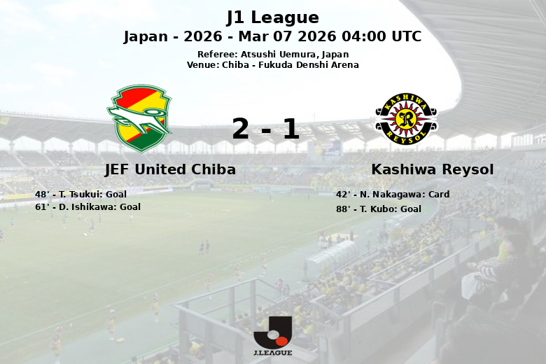El partido comenzó con un ritmo intenso, pero sin goles en la primera mitad. La primera tarjeta amarilla del encuentro fue para N. Nakagawa del Kashiwa Reysol al minuto 42. Ya en el segundo tiempo, T. Tsukui abrió el marcador para el JEF United Chiba al minuto 48. D. Ishikawa amplió la ventaja para los locales al minuto 61. Aunque el Kashiwa Reysol dominó en tiros a puerta con seis, solo hasta el minuto 88 T. Kubo logró descontar para el equipo visitante.