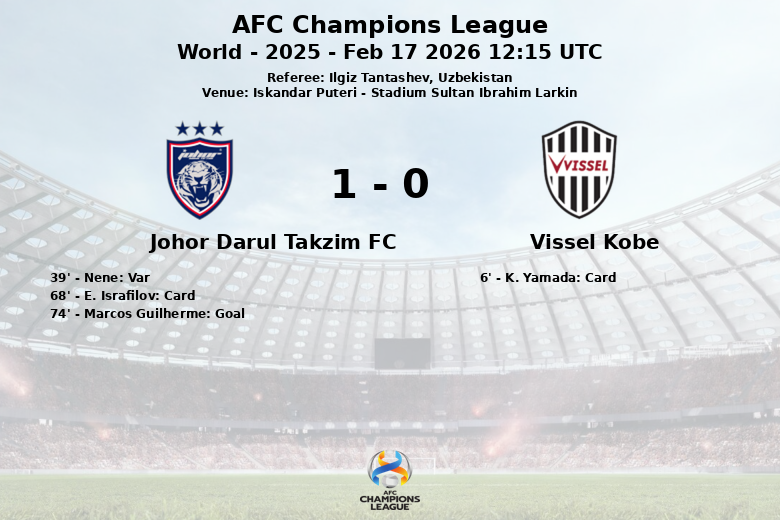 Iskandar Puteri, 17 de febrero de 2026 – En un encuentro correspondiente a la AFC Champions League, el Johor Darul Takzim FC se impuso al Vissel Kobe en el Stadium Sultan Ibrahim Larkin. El partido, arbitrado por el uzbeko Ilgiz Tantashev, fue tenso y con pocas ocasiones claras.