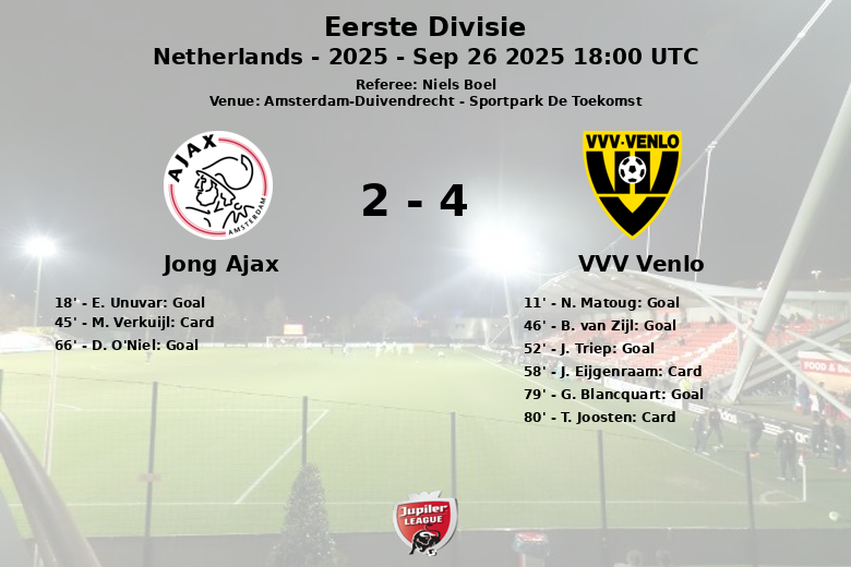El marcador se abrió temprano, al minuto 11, con un gol de N. Matoug para el VVV Venlo. Sin embargo, el Jong Ajax reaccionó rápidamente y E. Unuvar igualó el encuentro al minuto 18. El partido continuó con intensidad, y justo al comienzo del segundo tiempo, B. van Zijl puso nuevamente en ventaja al VVV Venlo al minuto 46, seguido de un tanto de J. Triep al minuto 52. El Jong Ajax intentó revertir la situación y D. O’Niel descontó al minuto 66, pero G. Blancquart selló la victoria para el VVV Venlo al minuto 79.