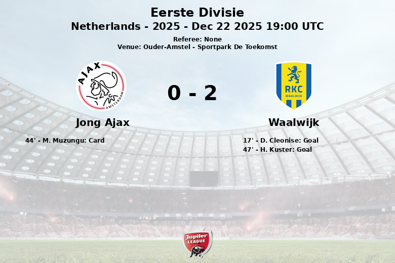 Ouder-Amstel, Países Bajos – En un encuentro correspondiente a la jornada 21 de la Eerste Divisie, el Waalwijk se llevó la victoria frente al Jong Ajax en el Sportpark De Toekomst. El partido, disputado el 22 de diciembre de 2025, se caracterizó por el dominio del Waalwijk, que supo aprovechar sus oportunidades de gol.