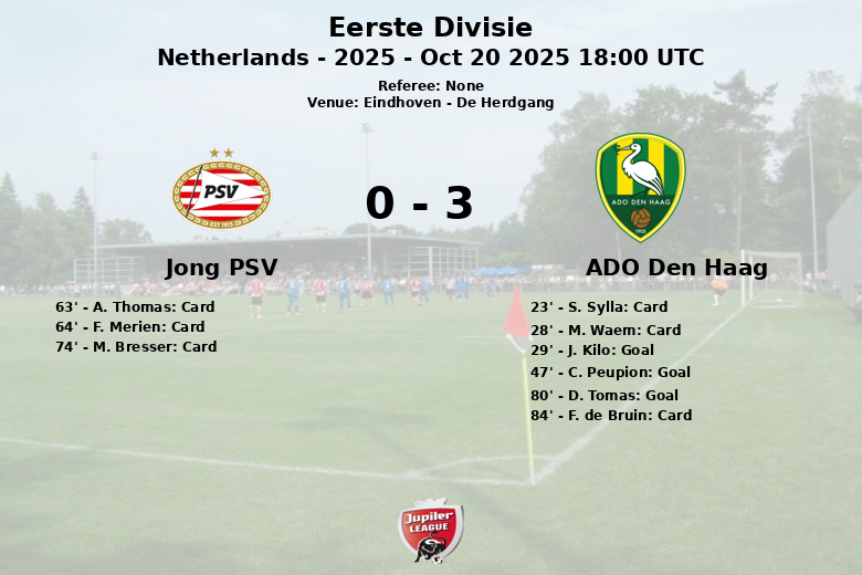 En un encuentro disputado en el estadio De Herdgang de Eindhoven, el ADO Den Haag se impuso con autoridad al Jong PSV, con un marcador final de 3 a 0. El partido, correspondiente a la jornada 12 de la Eerste Divisie, vio al ADO Den Haag controlar la posesión del balón con un 55%, generando un total de 21 disparos, de los cuales 7 fueron a puerta y 9 se marcharon desviados.
