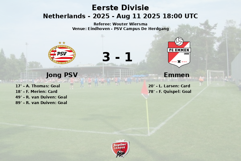 En la segunda mitad, el Jong PSV amplió su ventaja al minuto 49 con un gol de penalti convertido por R. van Duiven. El Emmen respondió con un gol de F. Quispel al minuto 78, asistido por J. Hawkins, acortando distancias en el marcador. Sin embargo, R. van Duiven selló la victoria para el Jong PSV al minuto 89 con su segundo gol del partido.