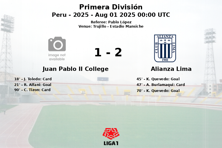 El Juan Pablo II College sorprendió inicialmente con un gol de R. Alfani al minuto 21, asistido por C. Tizon, tras una jugada elaborada. Sin embargo, la alegría local duró poco. K. Quevedo igualó el marcador para Alianza Lima justo antes del descanso, al minuto 45, con una asistencia de P. Ceppelini.
