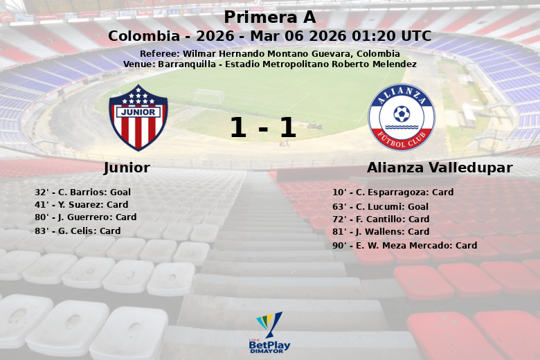 Barranquilla, Colombia – En un encuentro disputado en el Estadio Metropolitano Roberto Meléndez, Junior y Alianza Valledupar igualaron en un partido correspondiente a la décima jornada de la Primera A colombiana. El encuentro, arbitrado por Wilmar Hernando Montaño Guevara, se caracterizó por su intensidad y el alto número de tarjetas amarillas.