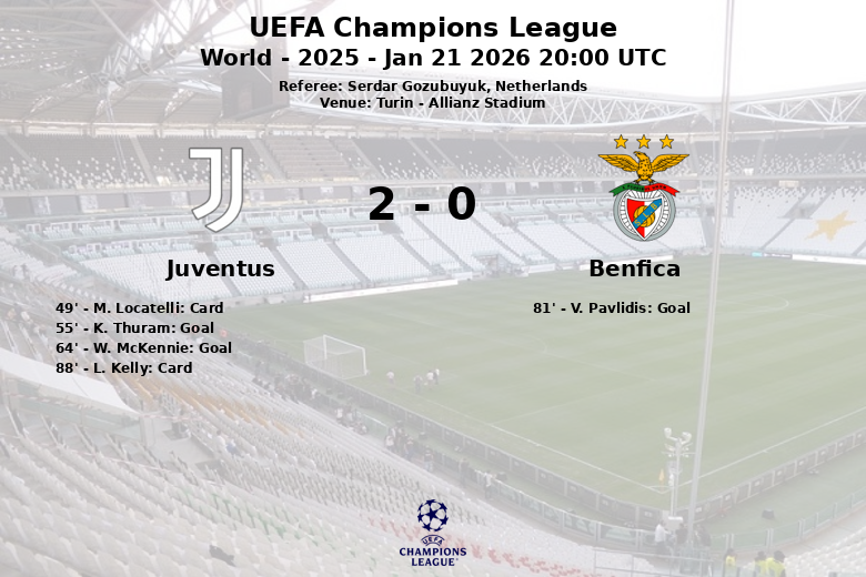 El primer gol de la Juventus llegó en el minuto 55, gracias a K. Thuram. La Vecchia Signora amplió su ventaja en el minuto 64 con un tanto de W. McKennie. El Benfica, a pesar de su mayor posesión y un mayor número de intentos de tiros (16 frente a 12 de la Juventus), solo logró concretar un gol tardío en el minuto 81 por medio de V. Pavlidis tras un penalti fallado.