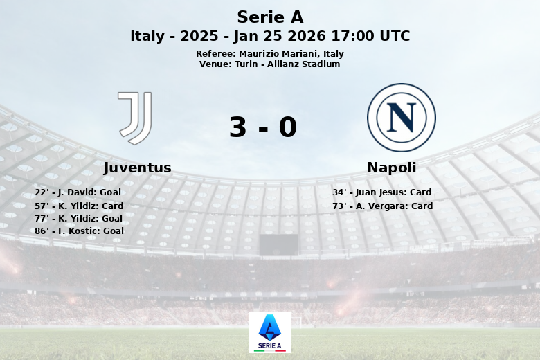 Turín, Italia – En un vibrante encuentro disputado en el Allianz Stadium, la Juventus derrotó al Napoli con un marcador de 3 a 0, en un partido correspondiente a la jornada 22 de la Serie A. El equipo local supo aprovechar sus oportunidades, mostrando una gran efectividad de cara al gol.
