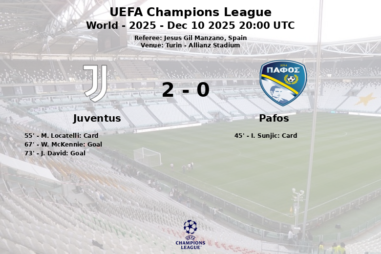 Fue en el minuto 67 cuando W. McKennie rompió el empate con un gol, asistido por A. Cambiaso, desatando la alegría en la afición local. Poco después, en el minuto 73, J. David amplió la ventaja para la Juventus, gracias a una asistencia de K. Yildiz, consolidando la victoria del equipo italiano. El Pafos, por su parte, intentó reaccionar pero solo logró 12 disparos, con 3 a puerta, y 4 saques de esquina.