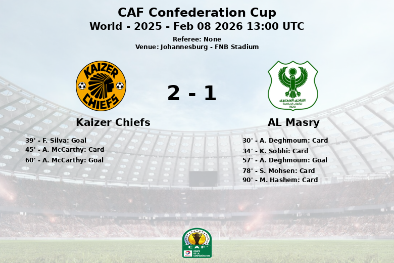 Kaizer Chiefs abrió el marcador al minuto 39 gracias a un penal convertido por F. Silva. La primera mitad también estuvo marcada por las tarjetas amarillas a A. Deghmoum (AL Masry), K. Sobhi (AL Masry) y A. McCarthy (Kaizer Chiefs).