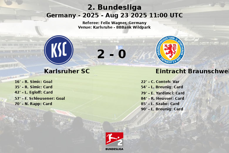 El Karlsruher SC abrió el marcador temprano, al minuto 16, con un gol de R. Simic asistido por S. Jung. El Eintracht Braunschweig intentó responder, pero un gol de C. Conteh fue anulado por fuera de juego al minuto 22 tras la revisión del VAR. El Karlsruher SC amplió su ventaja en el minuto 57 gracias a un gol de F. Schleusener.