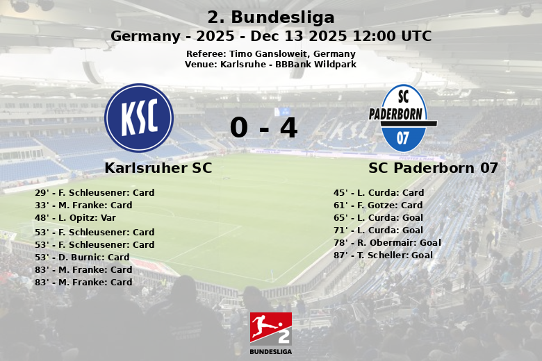 A partir de la expulsión, el Paderborn aprovechó su superioridad numérica. L. Curda abrió el marcador en el minuto 65, asistido por F. Gotze, y amplió la ventaja en el minuto 71. R. Obermair sumó otro gol en el minuto 78, con asistencia de M. Baur, y T. Scheller selló la victoria con un último gol en el minuto 87, asistido por Obermair. El Karlsruher sufrió otra expulsión en el minuto 83, esta vez de M. Franke.