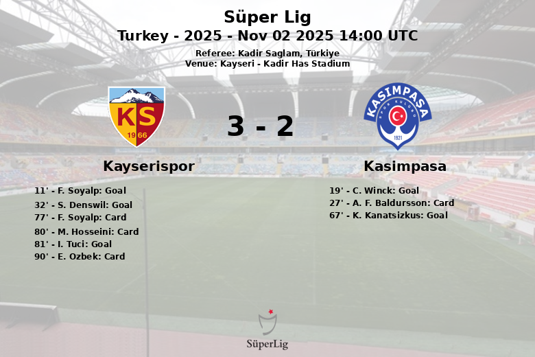 El Kayserispor se adelantó temprano en el minuto 11 gracias a un gol de F. Soyalp, asistido por J. Mendes. Sin embargo, la alegría local no duraría mucho, ya que C. Winck del Kasımpaşa empató el marcador en el minuto 19, con asistencia de A. Szalai. El Kayserispor volvió a tomar la delantera en el minuto 32 con un gol de S. Denswil, nuevamente con asistencia de J. Mendes, llevando el partido al descanso con un 2 a 1 favorable.