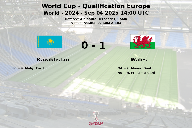 Astana, Kazajistán – Gales se impuso en su encuentro contra Kazajistán en el Astana Arena, dentro de las eliminatorias europeas para la Copa del Mundo. El único gol del partido llegó en el minuto 24, gracias a un remate preciso de K. Moore, asistido por L. Cullen.