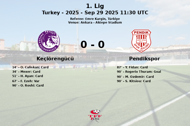 Keçiörengücü generó 9 tiros en total, de los cuales 2 fueron a puerta y 6 desviados, además de obtener 4 saques de esquina. Por su parte, Pendikspor realizó 11 tiros, logrando apenas 1 remate a puerta y 6 desviados, y obtuvo 1 tiro de esquina. El encuentro tuvo momentos de emoción, como el gol anulado por VAR a F. Ezeh del Keçiörengücü en el minuto 67 por fuera de juego, y un penal errado por Rogerio Thuram del Pendikspor en el minuto 90. A pesar de la intensidad, ninguno de los equipos logró romper el empate en el marcador. El árbitro Emre Kargin, de Turquía, tuvo una tarde ajetreada dirigiendo el encuentro.