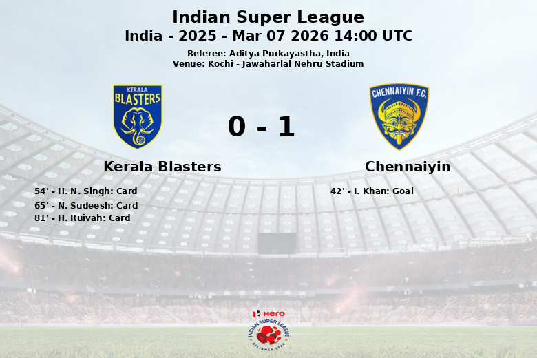 El único gol del partido llegó en el minuto 42, cuando I. Khan, asistido por A. Noguera, batió al portero de Kerala Blasters, sellando la victoria para Chennaiyin.