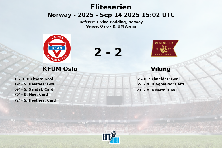 KFUM Oslo arrancó el partido con fuerza, abriendo el marcador en el primer minuto gracias a un gol de D. Hickson, asistido por H. Hoseth. Sin embargo, Viking respondió rápidamente, aprovechando un autogol de D. Schneider en el minuto 5 para igualar el encuentro. KFUM Oslo volvió a tomar la delantera en el minuto 19, con un tanto de S. Hestnes a pase de M. Njie. La primera mitad culminó con ventaja para los locales.