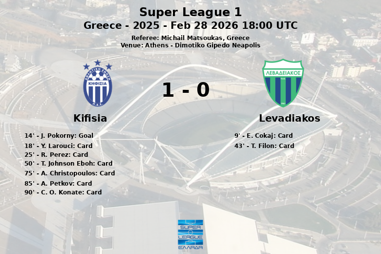 El encuentro, arbitrado por Michail Matsoukas, tuvo 20 faltas cometidas por Kifisia y 16 por Levadiakos. Aunque Levadiakos intentó generar peligro a través de cinco tiros de esquina, la defensa de Kifisia se mantuvo sólida y logró asegurar los tres puntos en casa. El partido correspondiente a la jornada 23 de la Super League 1, temporada 2025, demostró la lucha constante por cada punto en el campeonato griego.