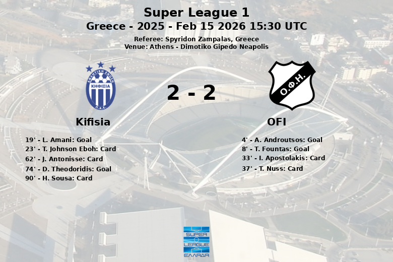 Apenas al minuto 4, A. Androutsos, asistido por T. Nuss, abrió el marcador para el OFI, sembrando la esperanza entre sus seguidores. La alegría se multiplicó tan solo cuatro minutos después, cuando T. Fountas, con la colaboración de N. Athanasiou, amplió la diferencia. Sin embargo, el Kifisia no se amilanó y comenzó a ejercer presión, logrando descontar al minuto 19 gracias a L. Amani, quien aprovechó una asistencia de D. Simon.