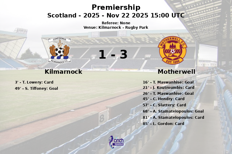 Motherwell dominó la posesión del balón con un 59%, frente al 41% de Kilmarnock. El primer gol del encuentro llegó temprano, al minuto 16, cortesía de T. Maswanhise, con asistencia de E. Longelo, poniendo en ventaja al conjunto visitante. Maswanhise volvió a marcar al minuto 26, ampliando la diferencia a favor de Motherwell. Kilmarnock intentó reaccionar, y S. Tiffoney descontó al minuto 49, con asistencia de B. Anderson. Sin embargo, A. Stamatelopoulos sentenció el partido al minuto 68 con un gol de penal.